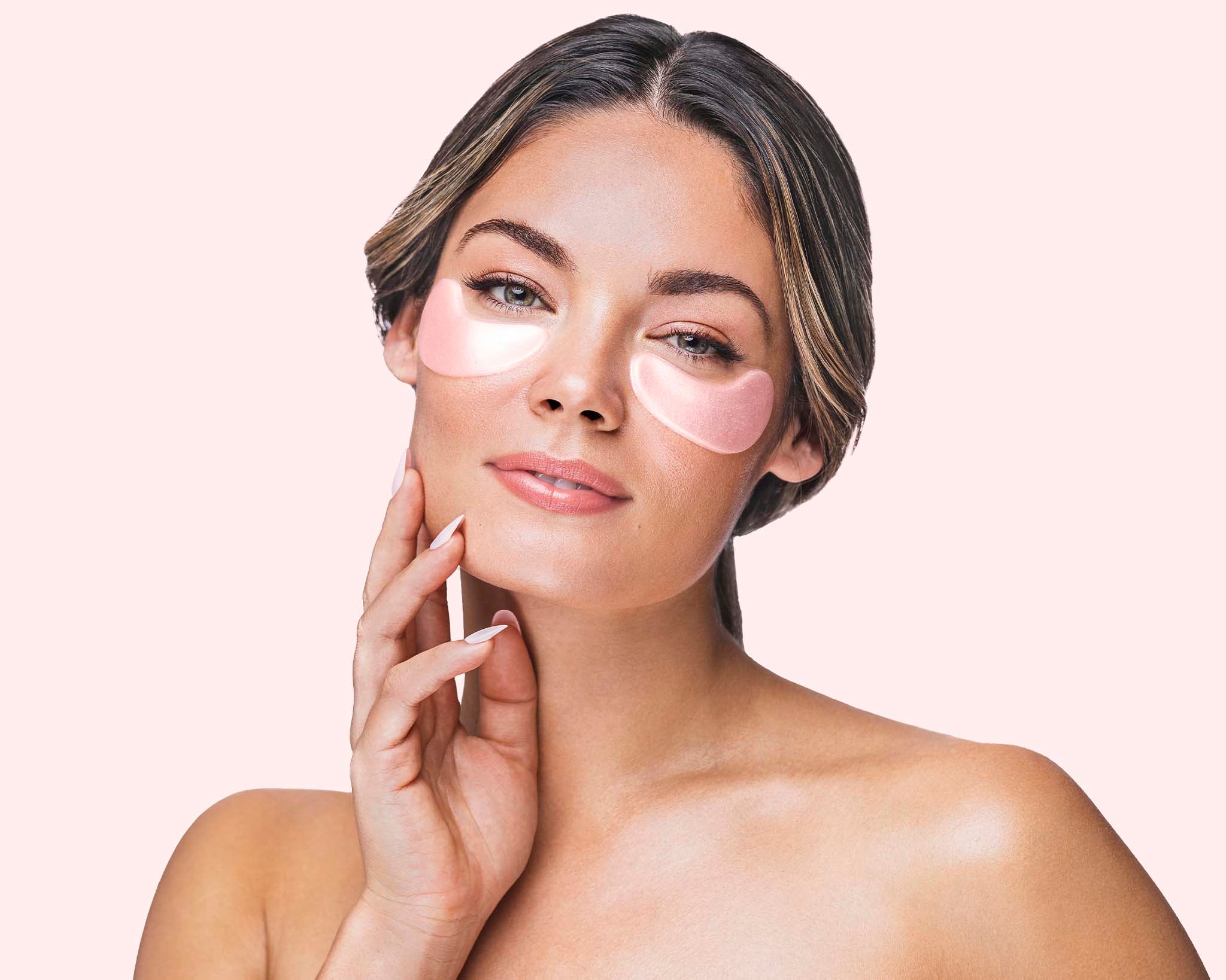 A woman using the Rose Quartz Antioxidant Collagen Eye Mask.